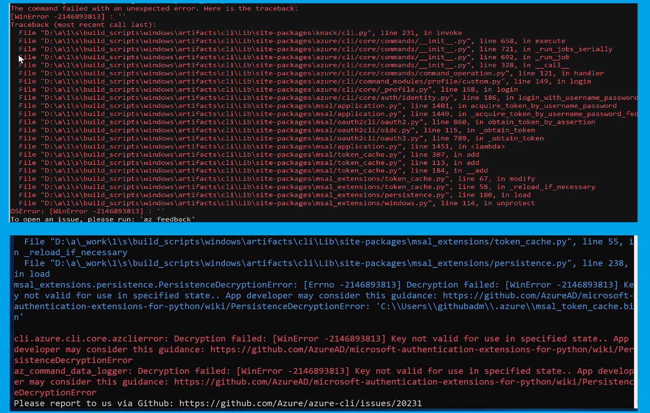 cli.azure.cli.core.azclierror: Decryption failed:[WinError -2146893813] Key not vaid for use in specified state..
