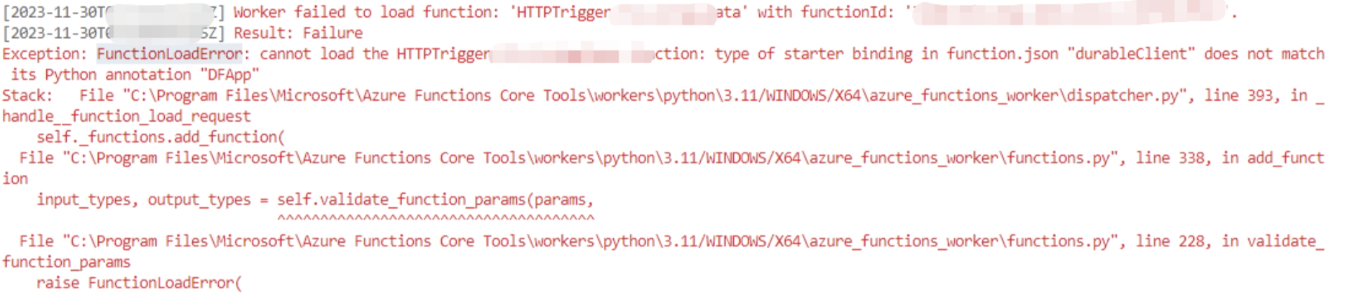 参考官方文档(使用 Python 创建你的第一个持久函数:https://learn.microsoft.com/zh-cn/azure/azure-functions/durable/quickstart-python-vscode), 部署后,却出现“Failed to load function”错误。