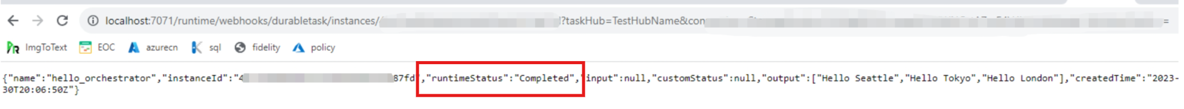 http://localhost:7071/api/httproute 这个可以返回 statusQueryGetUri 的 url ,http://localhost:7071/runtime/webhooks/durabletask/instances/xxxxxxxxxxxxxxxxx?taskHub=TestHubName&connection=Storage&code=xxxxxxxxxxxxxxxx,然后通过上面url 就可以看到 activity 的 结果了。