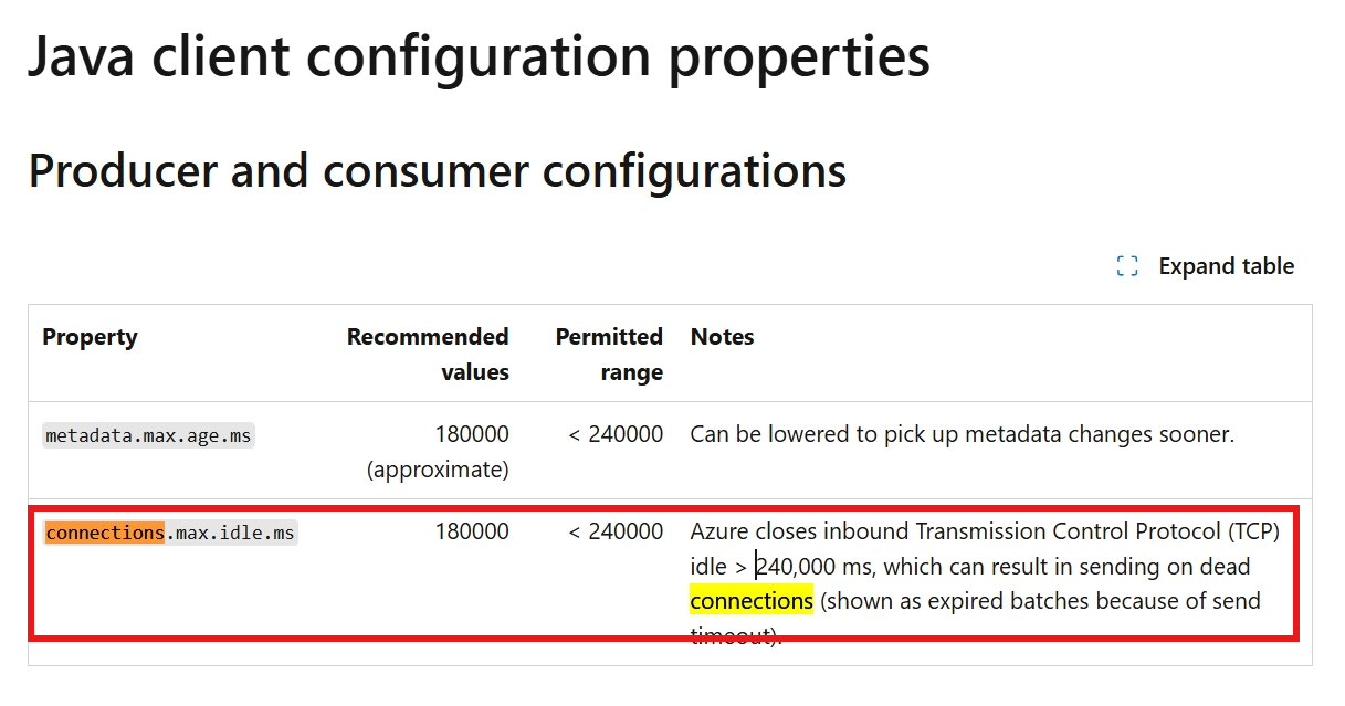 Azure closes inbound Transmission Control Protocol (TCP) idle > 240,000 ms, which can result in sending on dead connections (shown as expired batches because of send timeout).