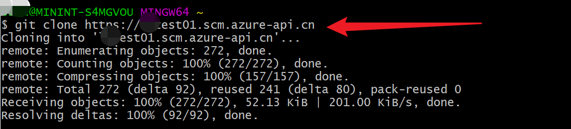 使用Git for Windows工具,在Git Bash 中输入clone指令: git clone https://.scm.azure-api.cn/, 根据弹出框输入用户名和密码, 通过APIM Repository 页面中的 Acess Credentials方式获取。