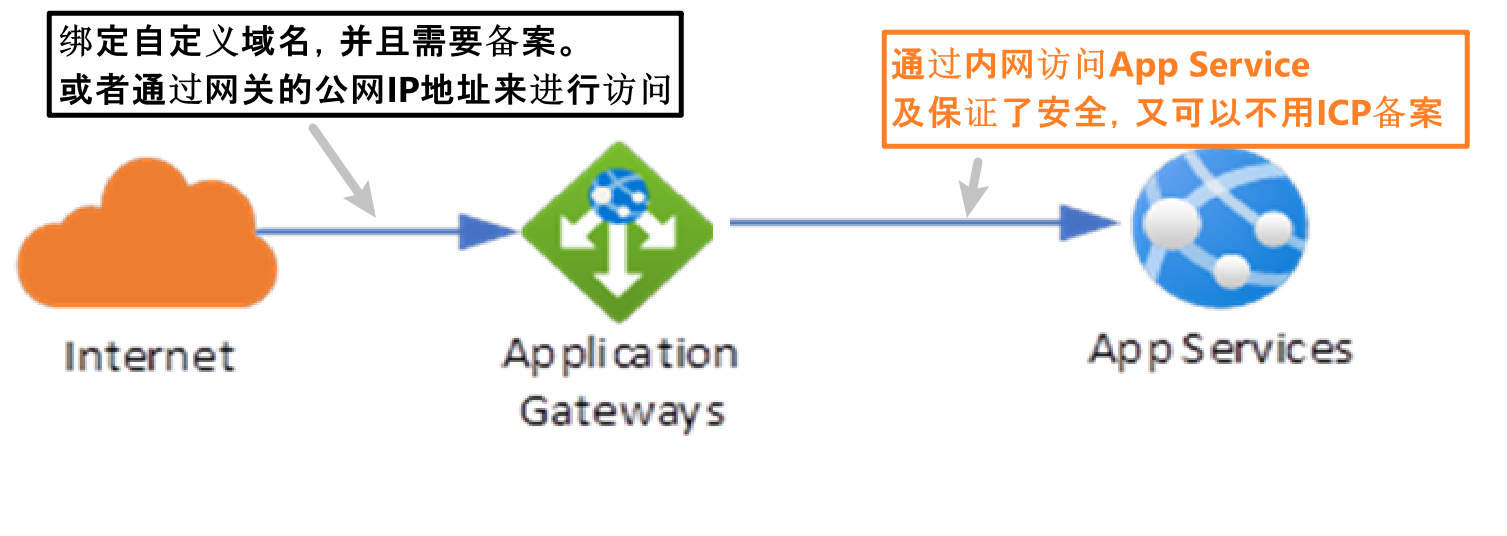 根据 “任何通过Internet对应用服务默认域名的访问将被封堵” 所以,需要把App Service放置在内部虚拟网络中(VNET)就可以避免ICP的问题。如在外层使用 “应用程序网关(Application Gateway)”. 架构图如下: