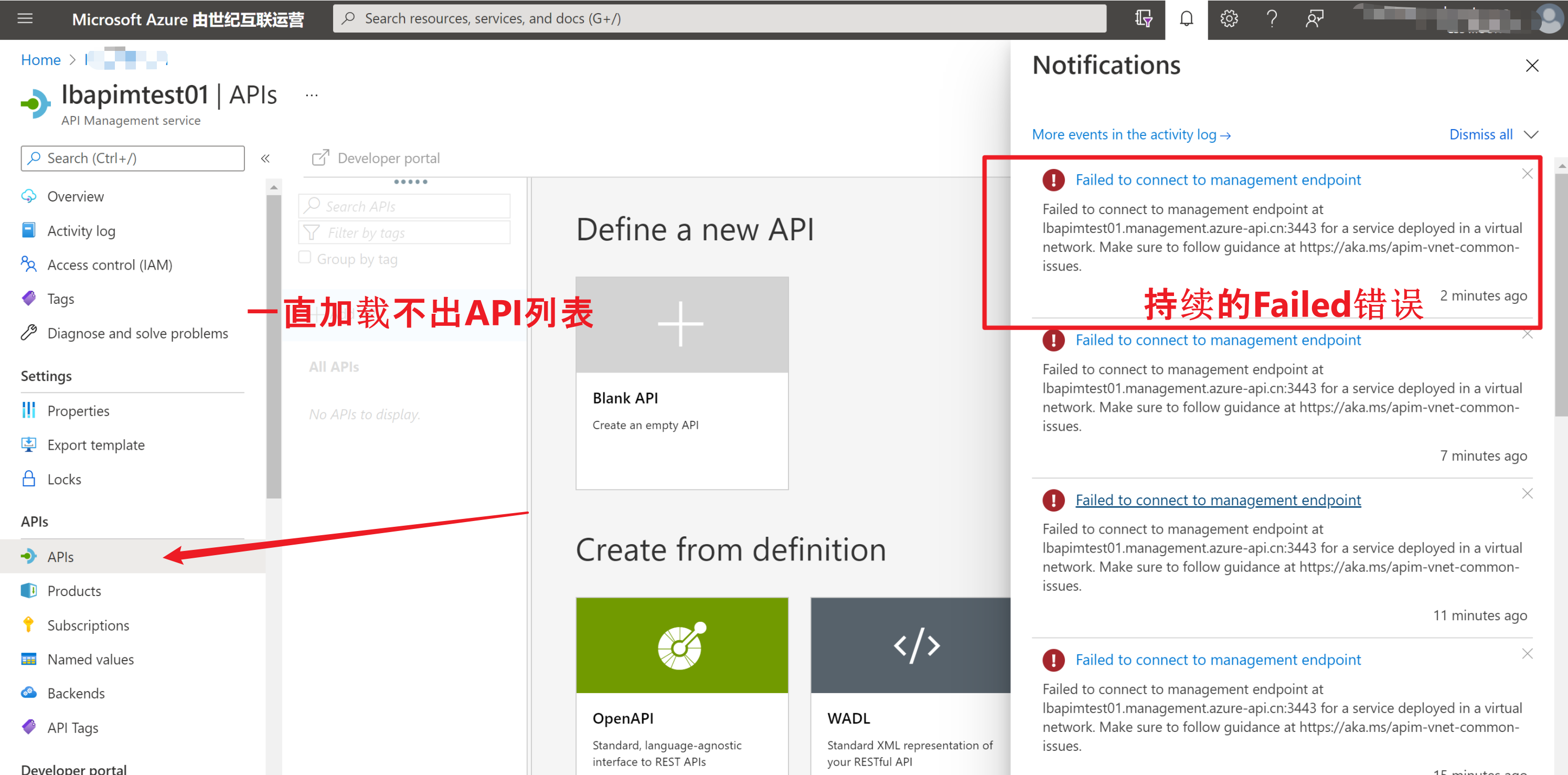 2)因为配置了自定义路由(UDR), 导致了APIM页面中的APIs,Repository等页面错误,且门户一直弹出Failed to connect to management endpoint错误消息