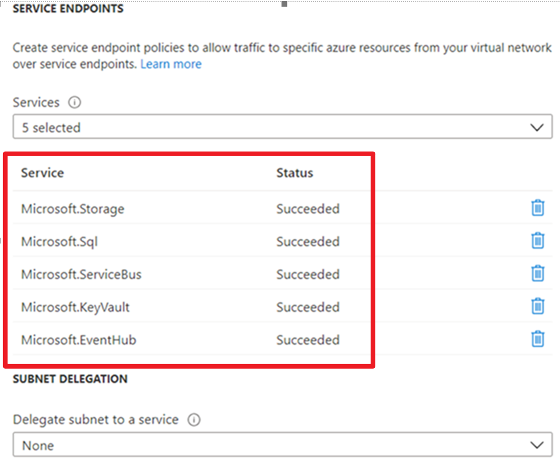 **第一项:**在部署 API 管理服务的子网上启用服务终结点。 需为 Azure SQL、Azure 存储、Azure 事件中心和 Azure 服务总线启用服务终结点。 直接从 API 管理委托的子网启用这些服务的终结点可以让它们使用 Azure 主干网络,为服务流量提供优化的路由。 如果将服务终结点与强制隧道 API 管理配合使用,则不会将上述 Azure 服务流量进行强制隧道传输。 其他 API 管理服务依赖项流量会通过强制隧道重定向,不能丢失,否则 API 管理服务会功能失常。