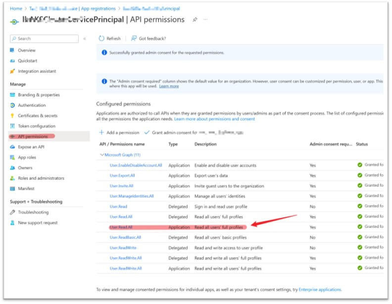 2) 如果遇见403 FORBIDDEN的情况,则想要为代码中所使用的AAD注册应用添加Microsoft.Graph的User.read.all权限