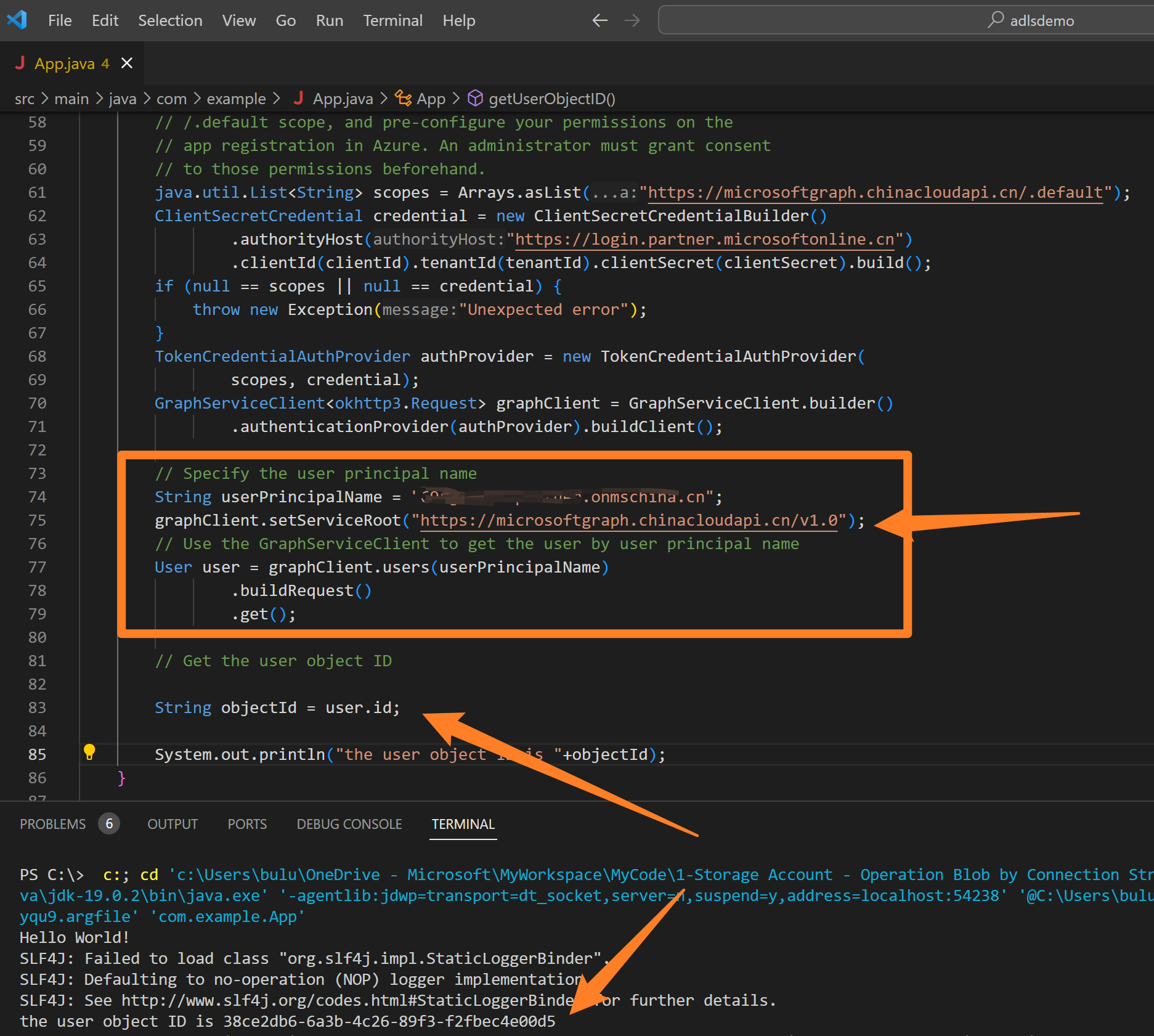 示例调用MSGraph SDK通过User principal name获取到User信息,如Object ID。