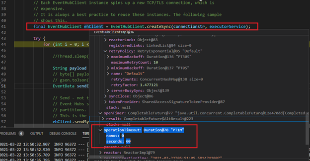 2021-03-23 15:18:42.578 INFO 104016 --- [pool-1-thread-1] c.m.azure.eventhubs.impl.MessageSender : clientId[EventHubClientImplb2e9d6-InternalSender], path[receivemessage], operationTimeout[PT1M30S], creating a send link