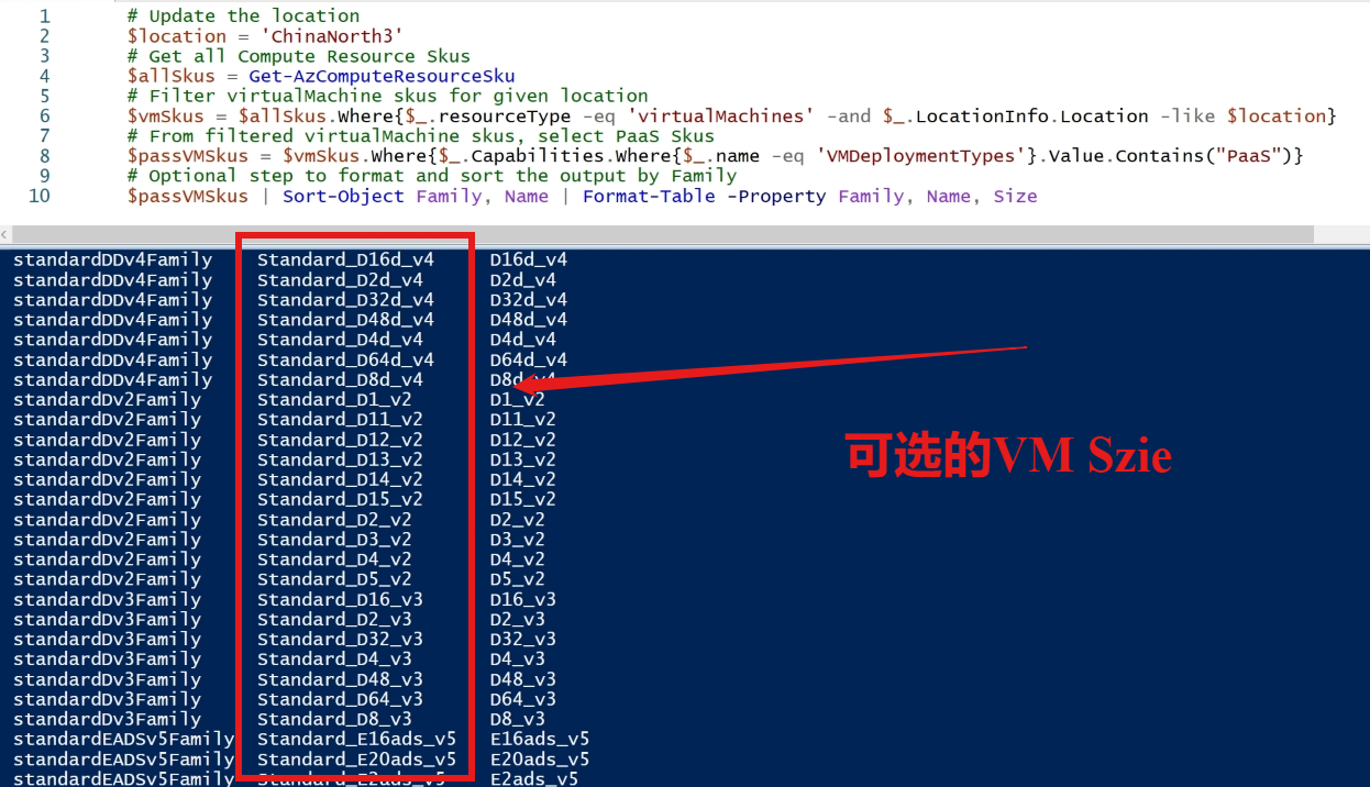 错误信息中,提示部署Cloud Service(云服务)时,所选择的VM Size(Standard_D4)被限制,分配失败。因为Cloud Service(云服务)所支持的VM Size在不同的区域会有所变动,需要先通过如下的PowerShell脚本来检索可以使用的VM Size List。