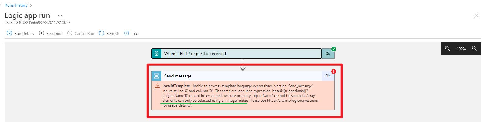 InvalidTemplate. Unable to process template language expressions in action 'Send_message' inputs at line '0' and column '0': 'The template language expression 'base64(triggerBody()?['objectName'])' cannot be evaluated because property 'objectName' cannot be selected. Array elements can only be selected using an integer index. Please see https://aka.ms/logicexpressions for usage details.'.