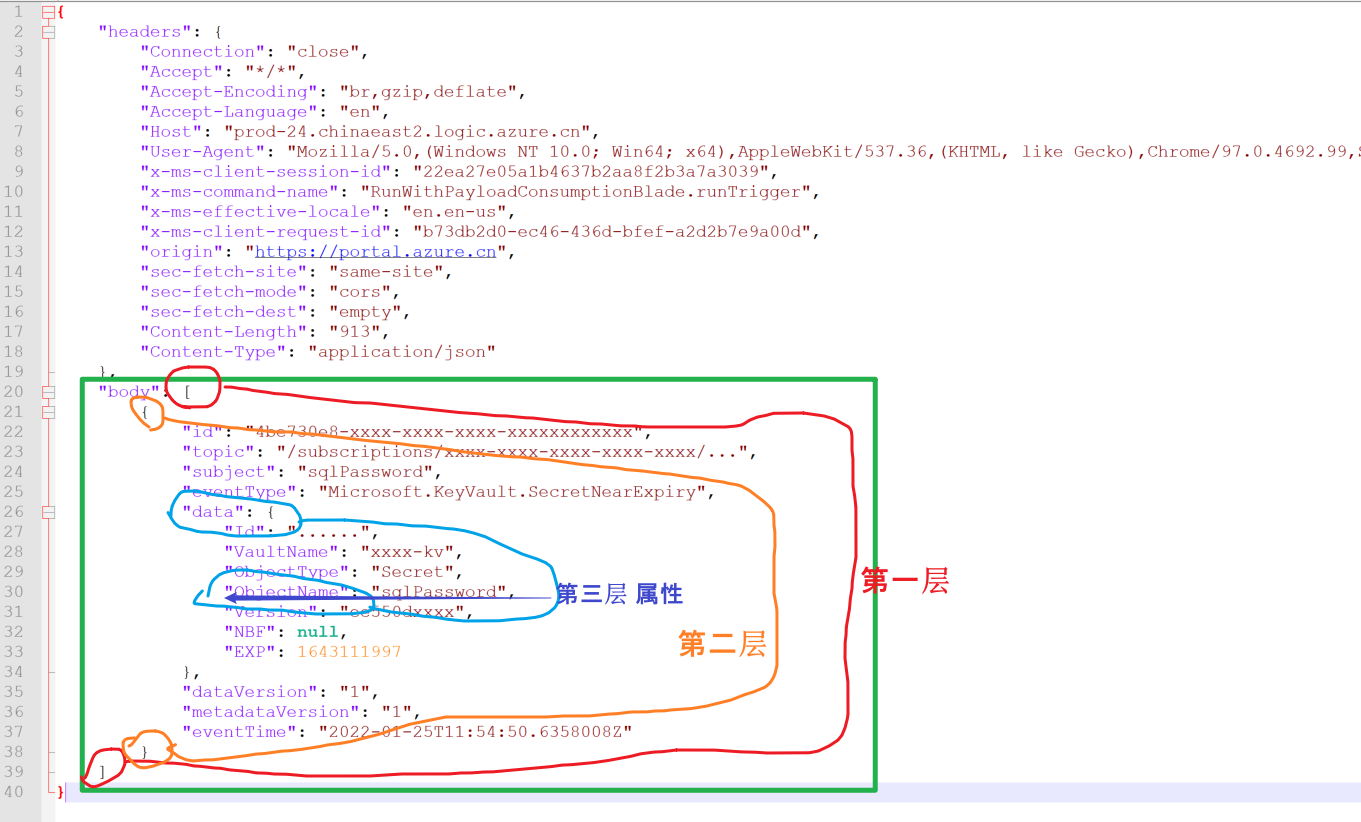 从错误消息(Array elements can only be selected using an integer index)分析,因为 triggerBody() 函数获取的对象为一个Array(数组),所以无法查找到ObjectName属性。那么分析Request所传递的Body JSON结构后,发现: