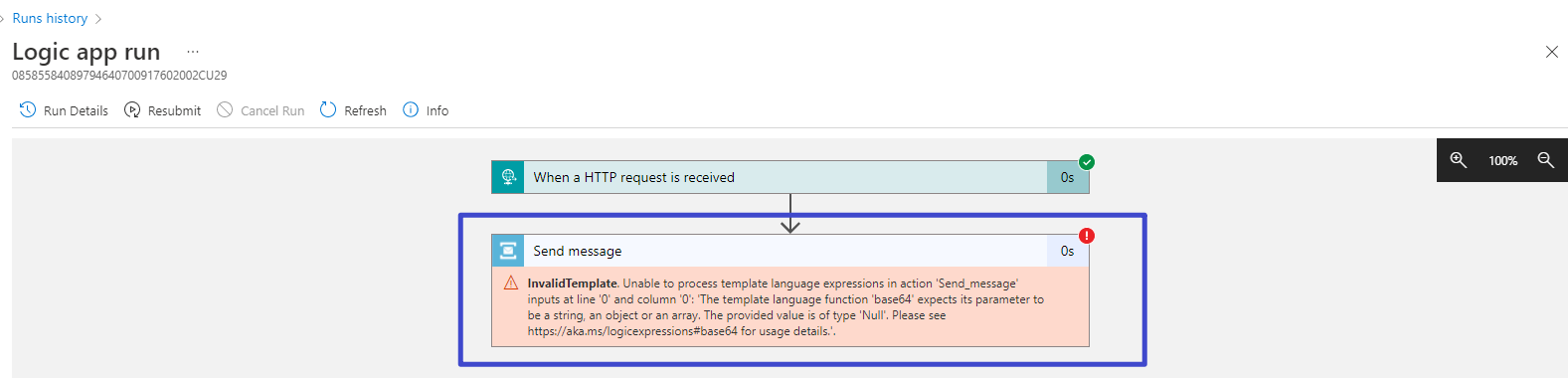 InvalidTemplate. Unable to process template language expressions in action 'Send_message' inputs at line '0' and column '0': 'The template language function 'base64' expects its parameter to be a string, an object or an array. The provided value is of type 'Null'. Please see https://aka.ms/logicexpressions#base64 for usage details.'.