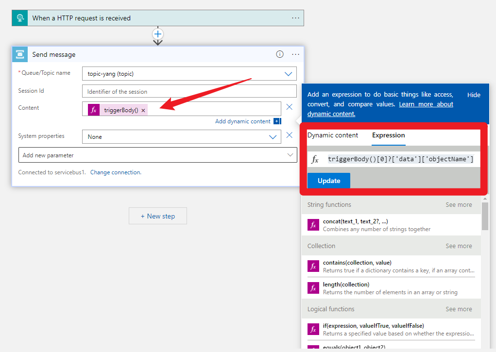 所以为了解决JSON中数组结构的取数问题,可以使用 Logic App的 Select Action 组件来完成数据的提取,但是如果能确定 HTTP Request Body中的数组只有一个元素,则可以在表达式中指定索引号或使用fist(), last()等函数获取数组中的对象。然后通过['属性名'] 来一级一级的获取数据,如本文中获取ObjectName属性值得正确表达式为: