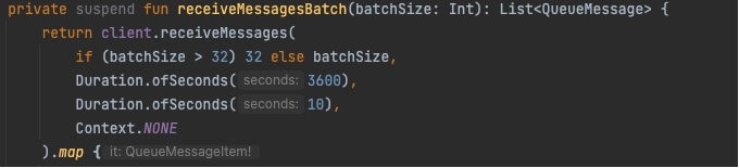maxMessages - Optional. Maximum number of messages to get, if there are less messages exist in the queue than requested all the messages will be returned. If left empty only 1 message will be retrieved, the allowed range is 1 to 32 messages. visibilityTimeout - Optional. The timeout period for how long the message is invisible in the queue. If left empty the received messages will be invisible for 30 seconds. The timeout must be between 1 second and 7 days. **timeout **- An optional timeout applied to the operation. If a response is not returned before the timeout concludes a RuntimeException will be thrown. context - Additional context that is passed through the Http pipeline during the service call.