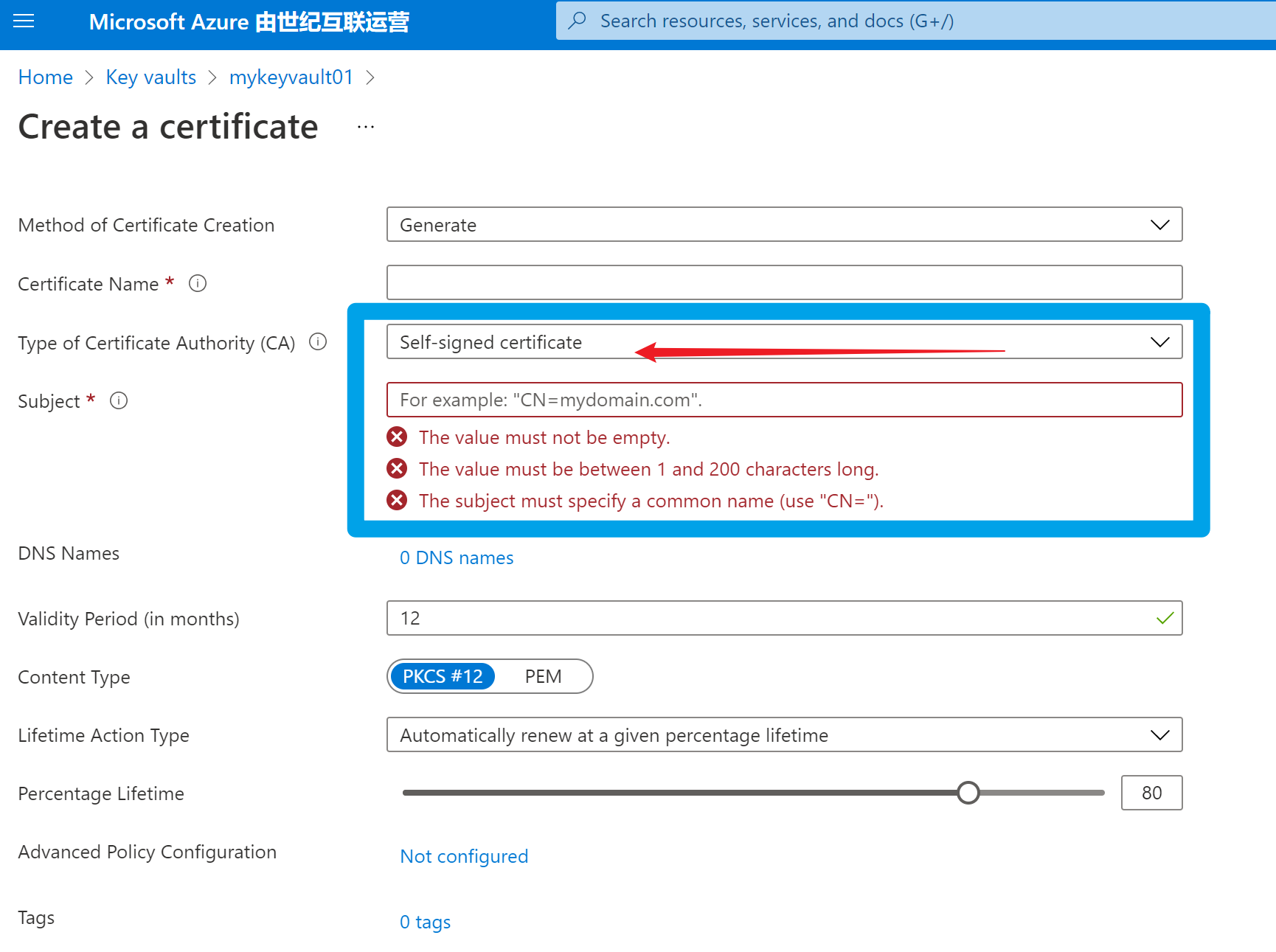 在Azure Key Vault中创建自签名证书时,不需要CA Provider。只需要在Subject 输入正确的CN=<域名信息>即可,操作非常简单。如下图: