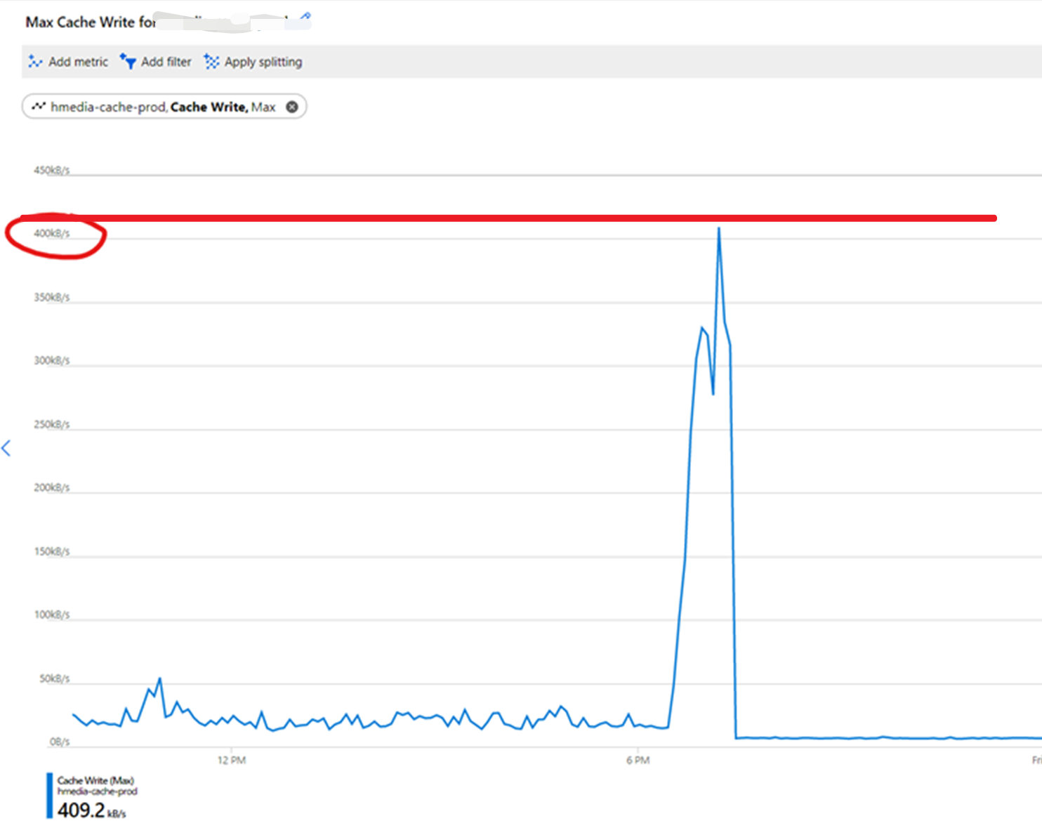 但是,只查看主节点的流量(注:Azure Redis有两个节点,一主一从),写入流量(409KB)与上图中的38.07MB却存在巨大的差别, 难到这是有连接直接操作从节点,而不通过主节点?