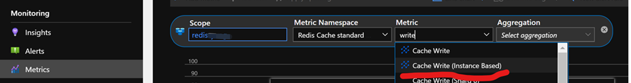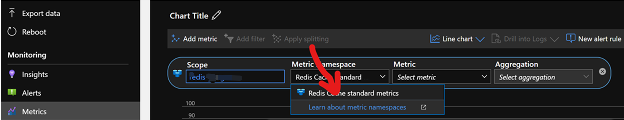 1)在Azure Redis的门户中,打开Metrics页面, 选取name space为Redis Cache standard metrics