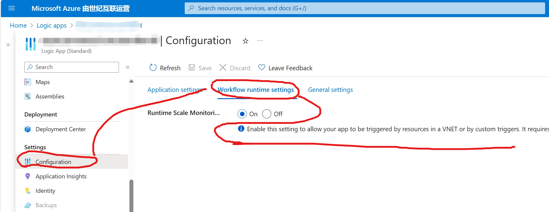 在“Setting”下选择“Configuration”,然后在“Workflow runtime settings”选项卡中,将“Runtime Scale Monitoring”设置为“On”。