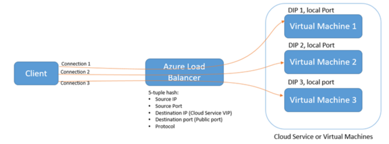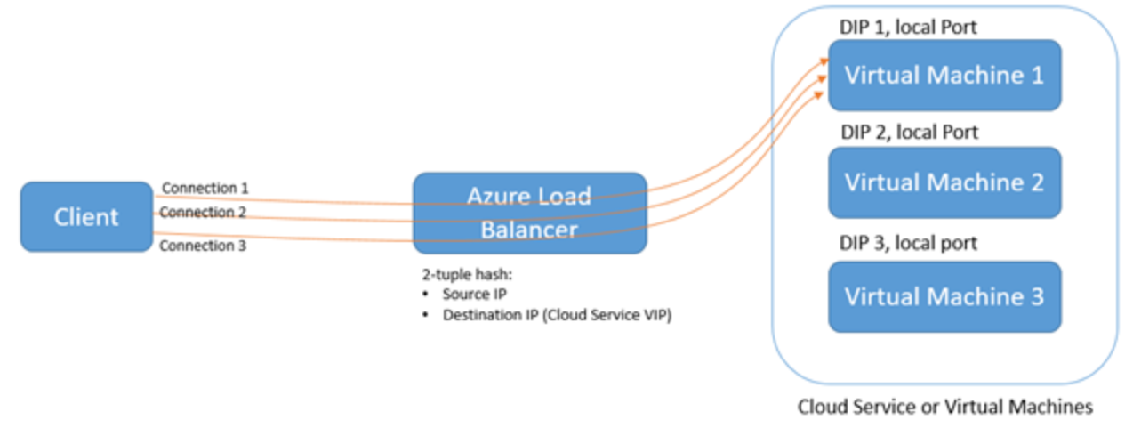 Packets in the same TCP or UDP session will be directed to the same datacenter IP (DIP) instance behind the load balanced endpoint. When the client closes and re-opens the connection or starts a new session from the same source IP, the source port changes and causes the traffic to go to a different DIP endpoint.