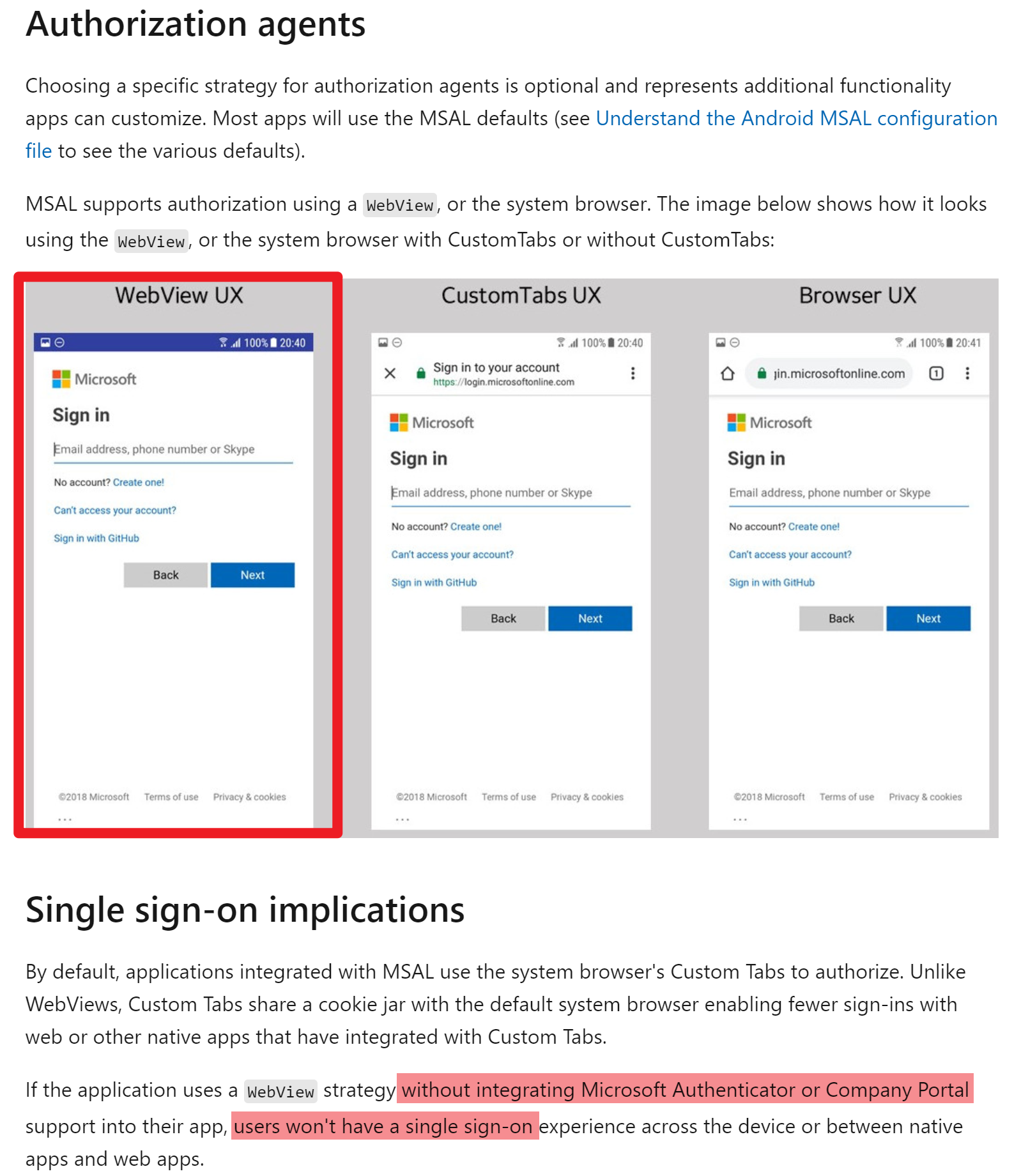 4) WEBVIEW和broken authentication在Android设备上的具体要求 https://docs.microsoft.com/en-us/azure/active-directory/develop/msal-android-single-sign-on#sso-through-system-browser