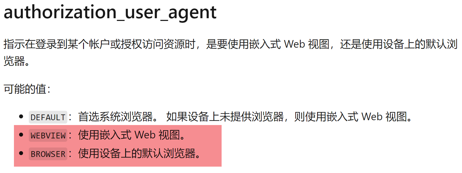 移动端集成MASL登录过程中,配置文件中配置项“authorization_user_agent”使用“DEFAULT”可以正常登录,但是改为“WEBVIEW”后就无法登陆,一直处于Loading状态。
