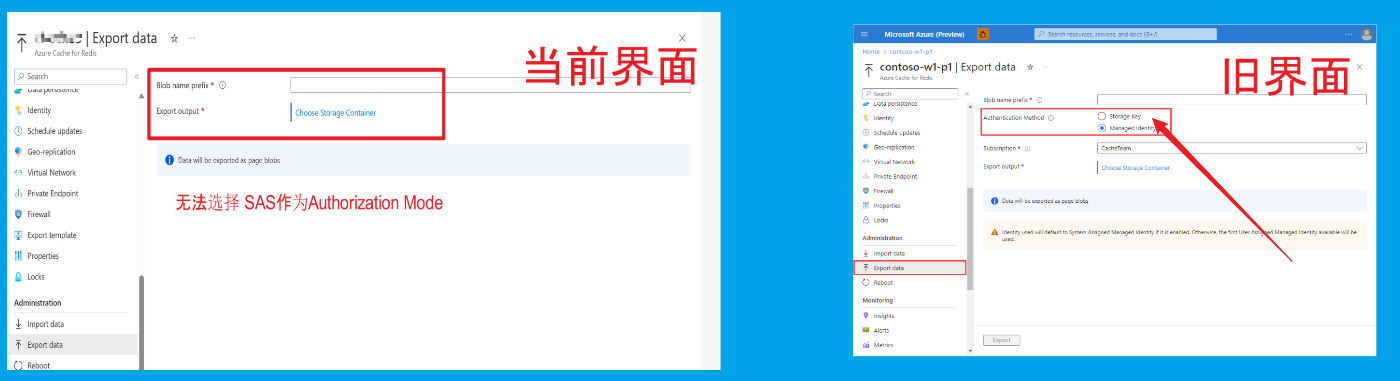 在Azure Redis的导出页面,突然不能配置Storage Account的SAS作为授权方式。
