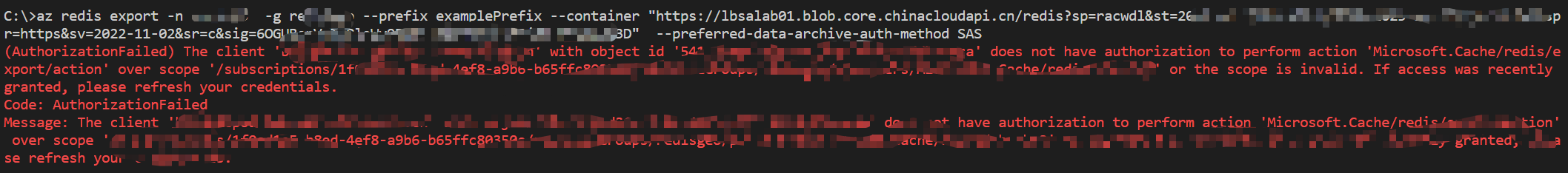 az redis export -n <redis-name> -g <resource-group> --prefix examplePrefix --container "<https://your-storage-account.blob.core.chinacloudapi.cn/redis?sp=racwdl&st=xxxx-xx-xxT13:45:12Z&se=xxxx-xx-xxT13:45:12Z&spr=https&sv=2022-11-02&sr=c&sig=********>" --preferred-data-archive-auth-method SAS