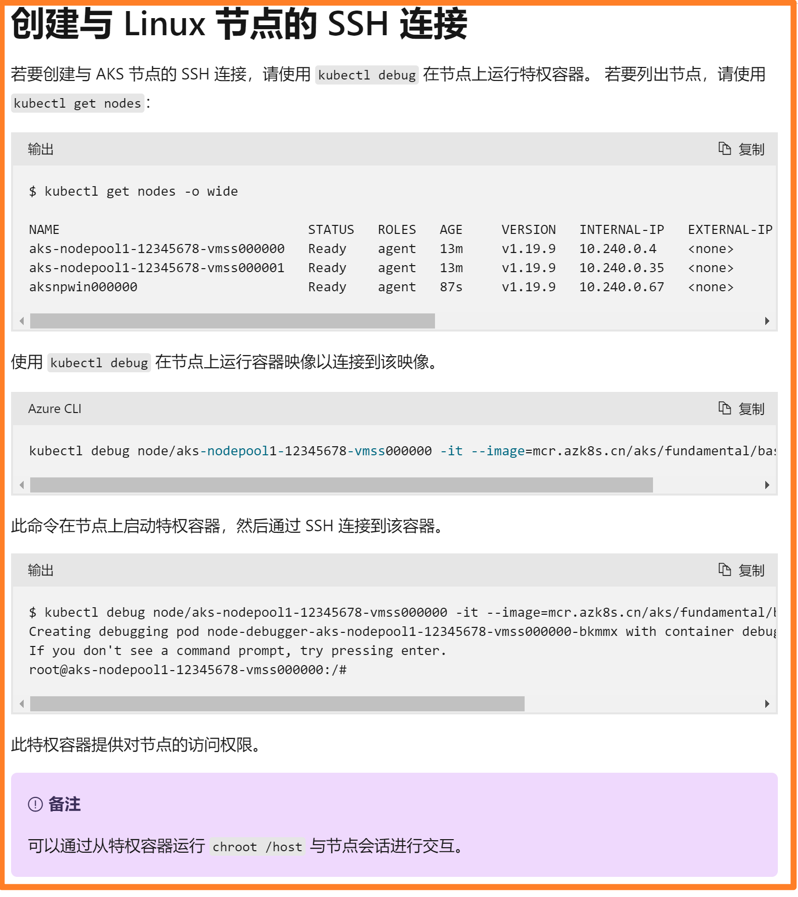 使用 SSH 连接到 Azure Kubernetes 服务 (AKS) 群集节点以进行维护或故障排除 : https://docs.azure.cn/zh-cn/aks/ssh#configure-virtual-machine-scale-set-based-aks-clusters-for-ssh-access