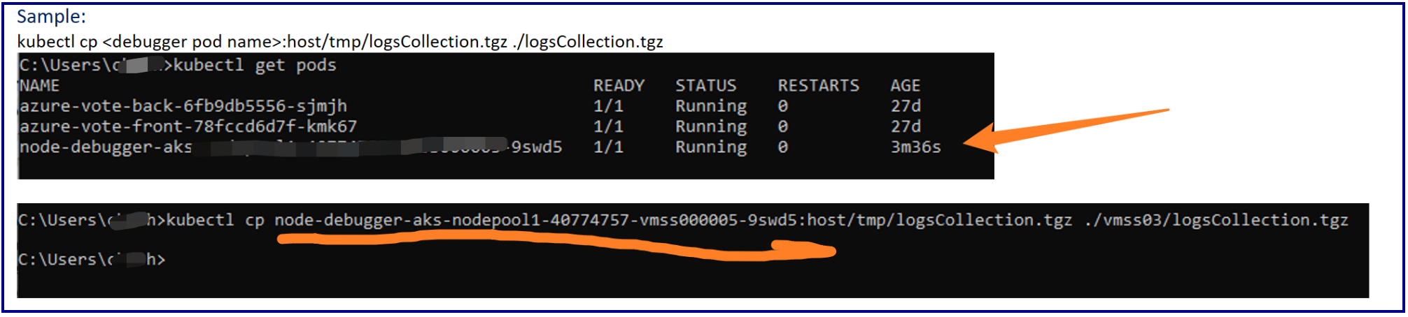 kubectl cp <node-debugger-aks-????-??????-vmss000003-???>:host/tmp/logsCollection.tgz ./logsCollection.zip