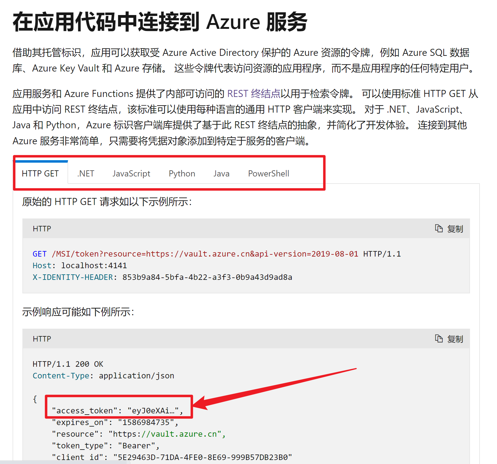 在根据《App Service 托管标识》的介绍,可以通过多种方式获取到对Azure资源的Token。如 HTTP GET, .NET, Java, PowerShell等。