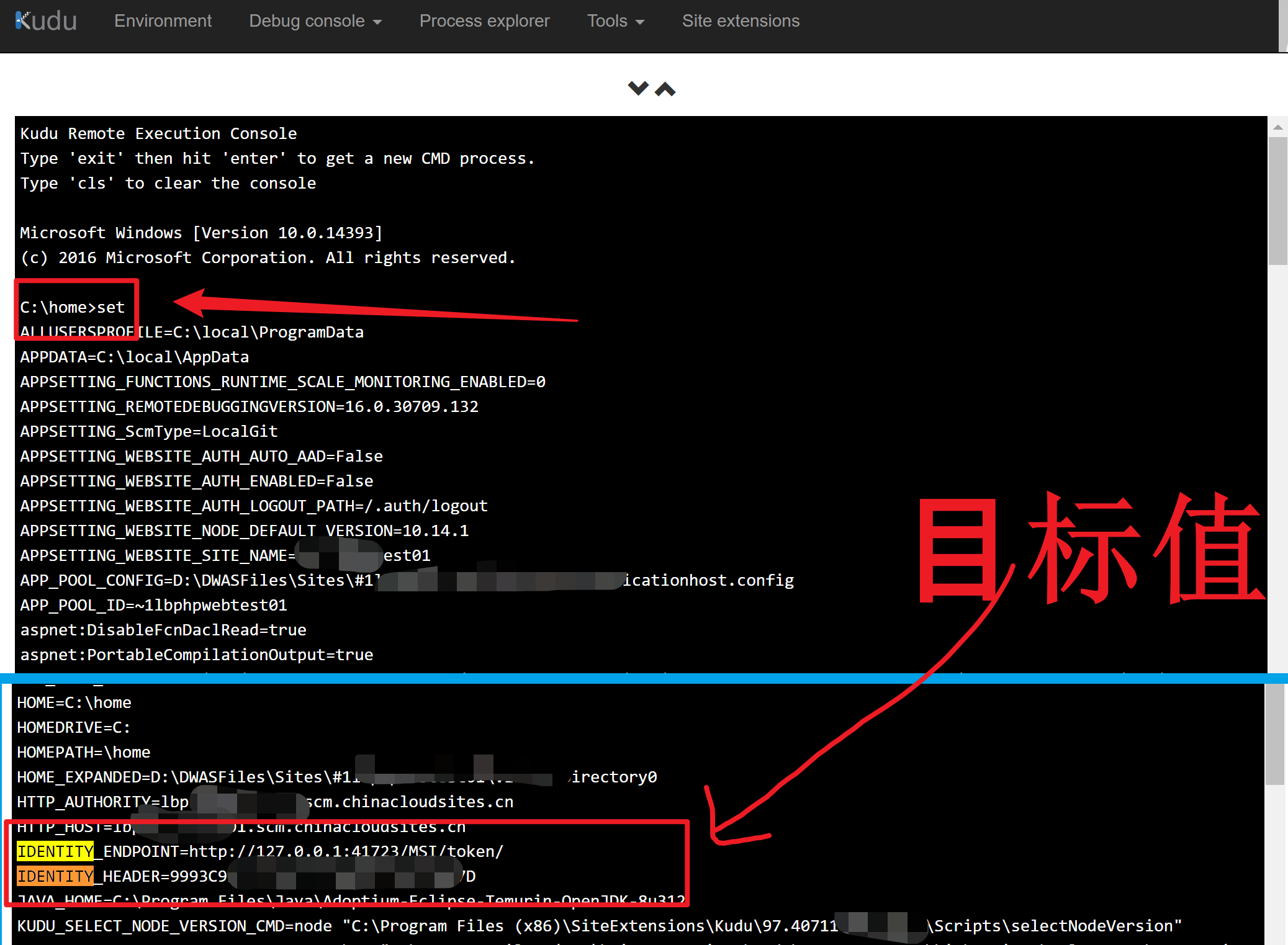 在App Service开启托管标识之后,会生成两个环境变量IDENTITY_ENDPOINT和IDENTITY_HEADER: