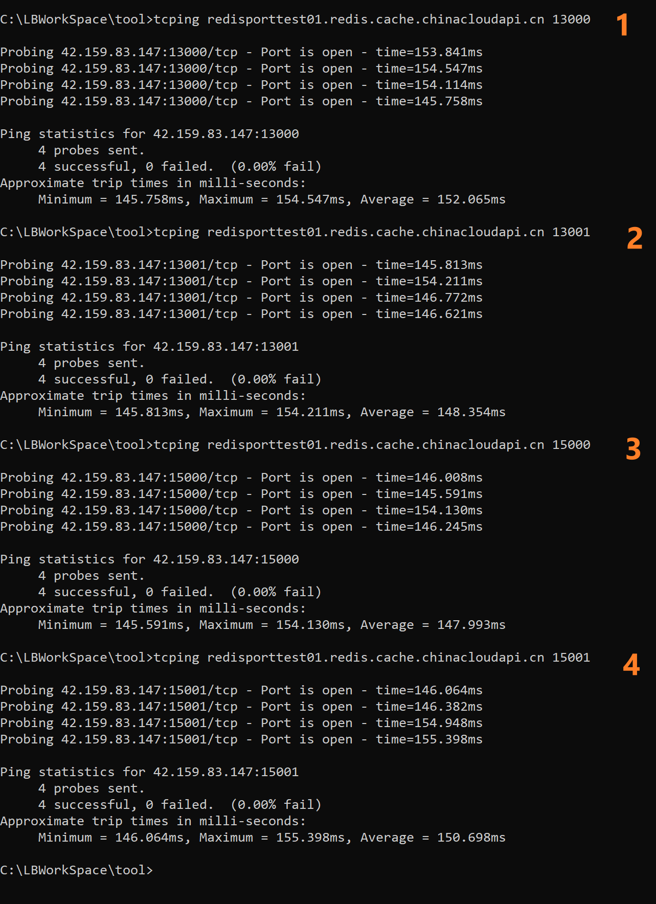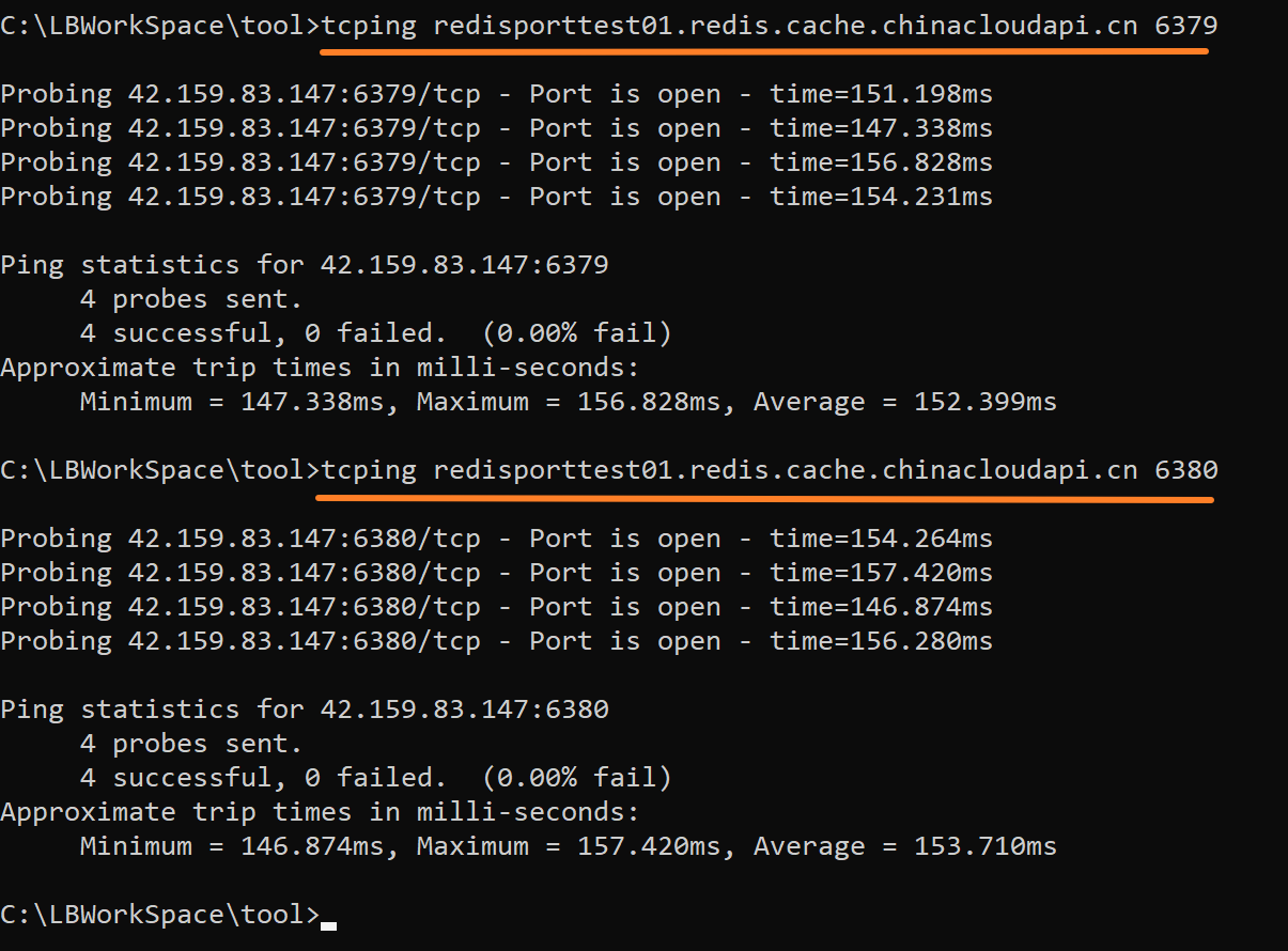 通过 tcpping Redis hostname 13000/13001/15000/15001 测试,均可以ping通。