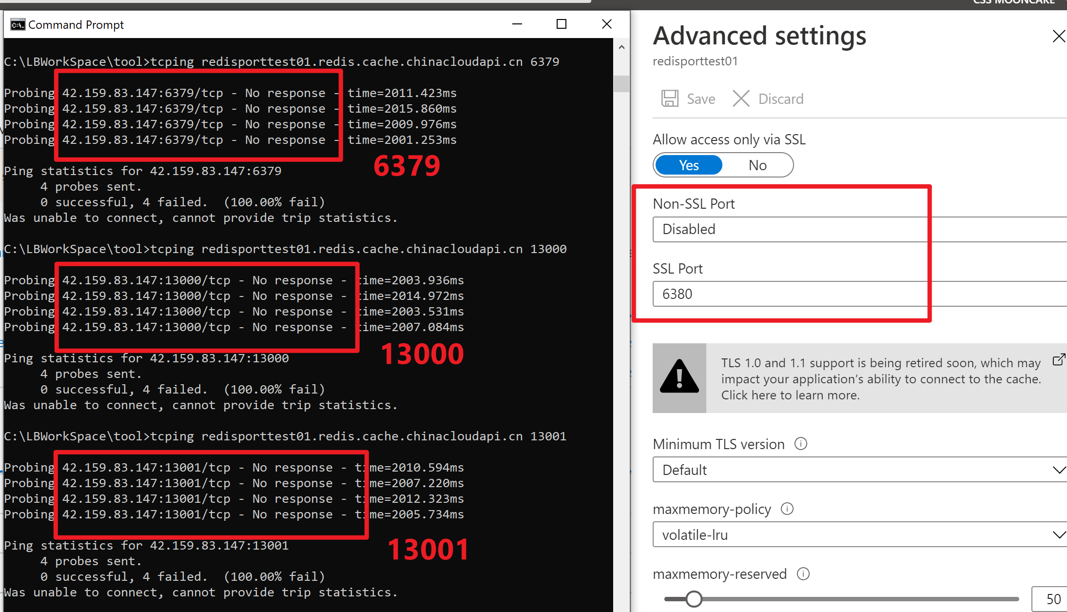 在使用安全检测工具对Azure Redis服务端口进行扫描时,发现Redis对外开放了13001, 13000,15000,15001端口。非常不理解的是,在门户上只开放了6379,6380这两个端口。那是为什么导致 1300N 和 ***1500N ***端口会是开放的呢?并且是对公网开放?