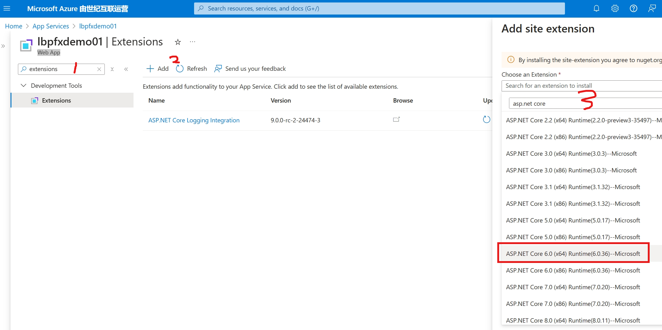 - Web App --> Extensions -->"Add" --> 使用 "ASP.NET Core " 关键字过滤