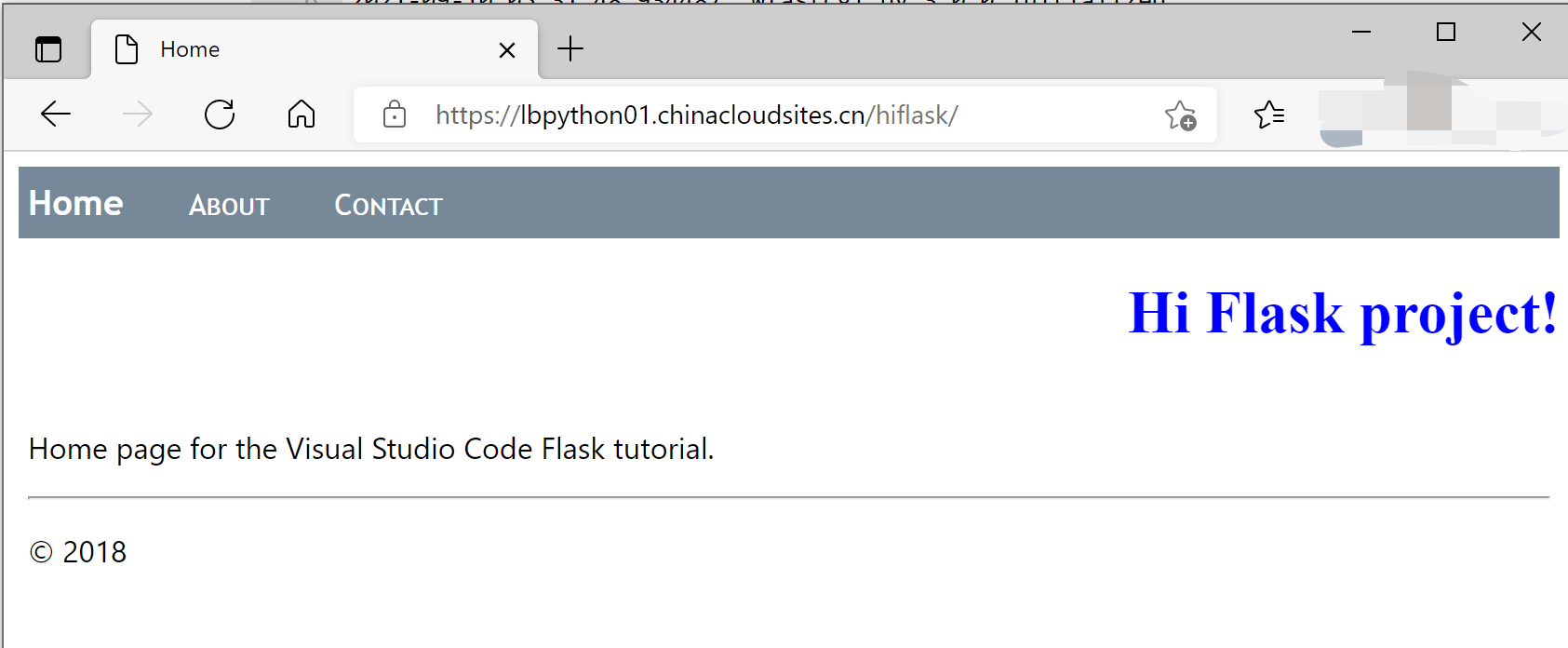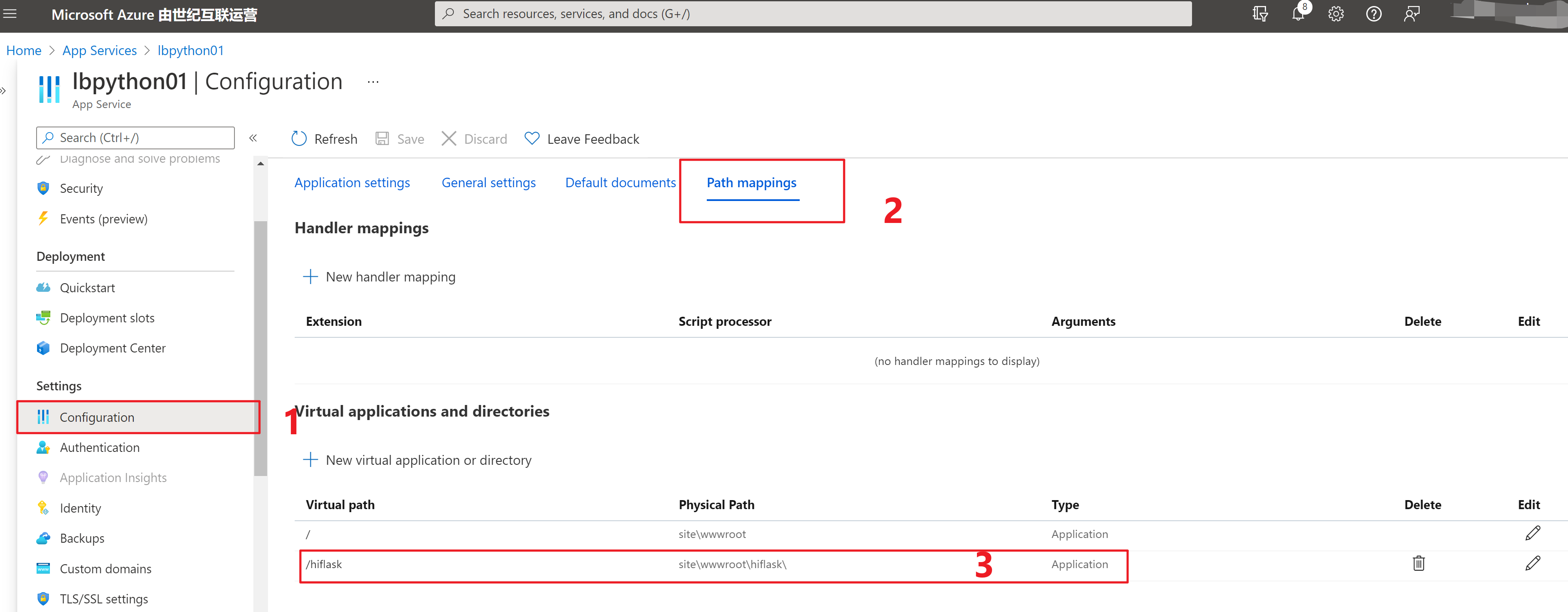 而在App Service中的解决方式就是添加了 PrefixMiddleware,并指定prefix为 /hiflask 。 附上完成的hiflask/app.py 代码和web.config内容。