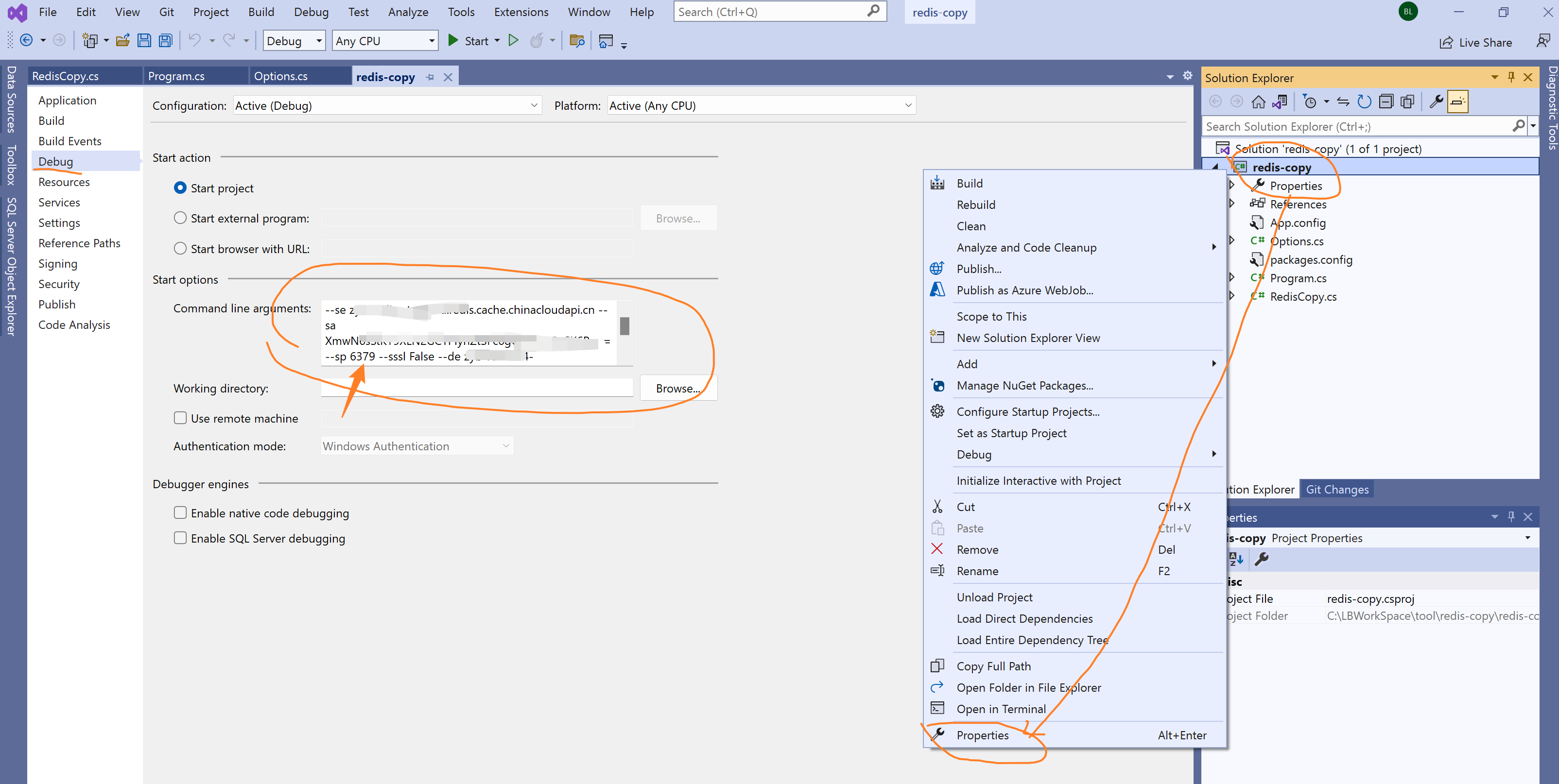 第二步:本地Visual Studio 工具打开后,把启动指令后面携带的参数填入Debug Start options中