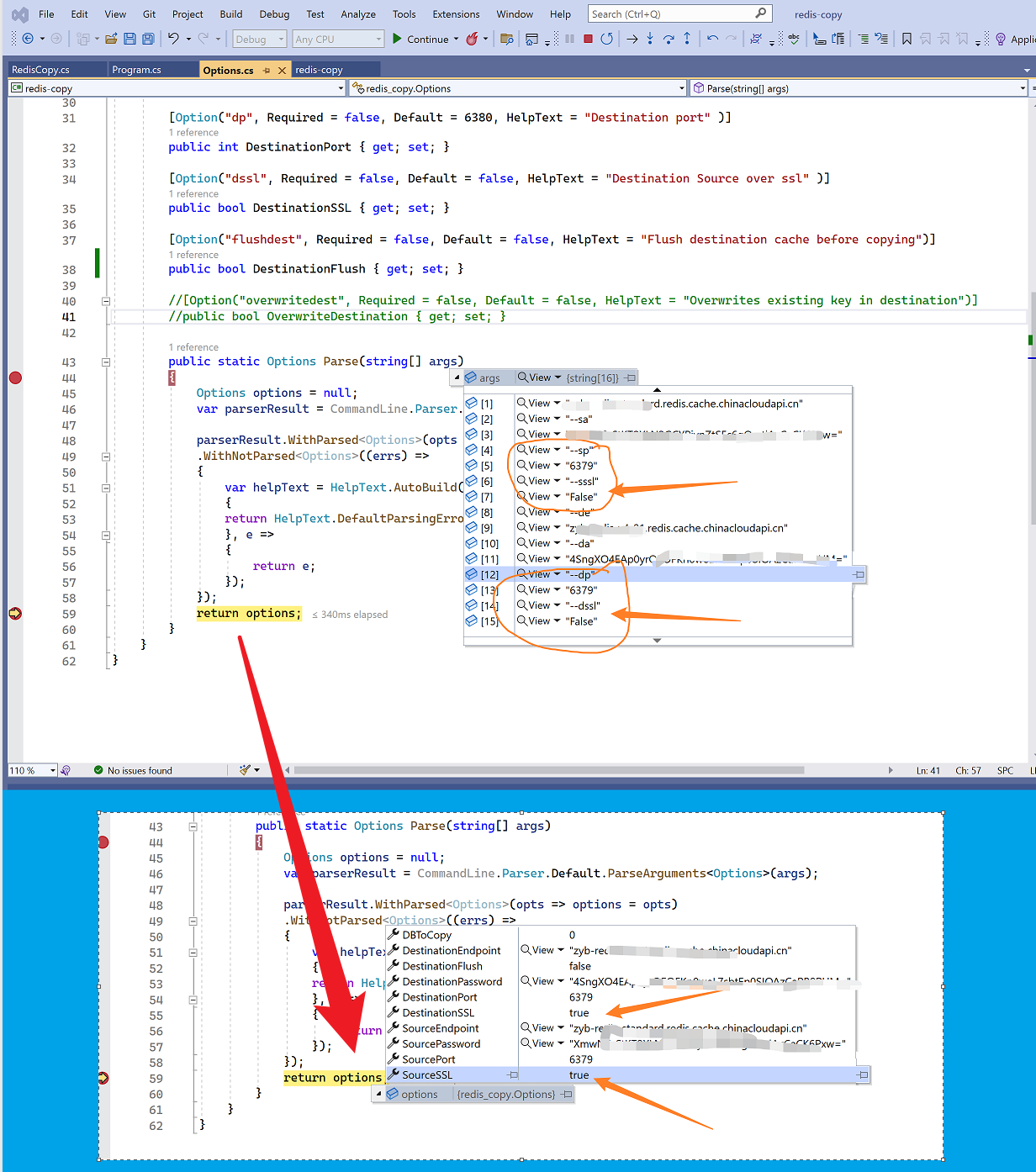 [主要]方案一:在Options.cs 文件中,修改 SourceSSL 和 DestinationSSL 的默认值为False。当需要使用6380端口连接时,携带 --sssl , --dssl参数